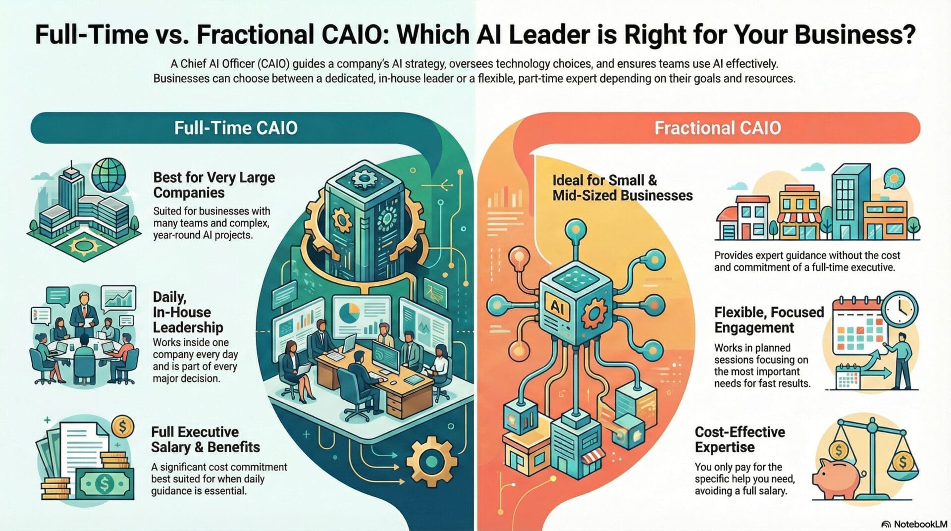 A full CAIO fits very large companies. A fractional CAIO fits most small and mid sized businesses. Both help companies grow, but the right choice depends on your size, budget, and goals.